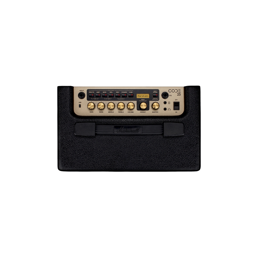 Il Marshall CODE 25 offre tutti i classici suoni che Marshall ha sviluppato per anni in un amplificatore combo facilmente trasportabile. Puoi lasciarti ispirare dai 100 Preset disponibili e creare i tuoi suoni grazie alle simulazioni di preamplificatori, finali e cabinet presenti. Il Marshall Code 25 dispone di una potenza di 25 Watt con uno speaker da 10″, che lo rende perfetto per casa o piccoli palchi.