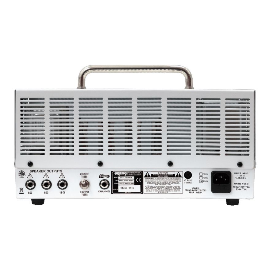 Orange Dual Terror head DT30H è la più potente della serie Terror, offrendo headroom e volume più puliti rispetto alla Tiny Terror con in aggiunta la flessibilità di un secondo canale. Il Tiny Terror Channel è riportato direttamente dalla versione originale da 15W, mantenendo i toni inconfondibili che hanno reso la Tiny Terror così popolare. Comunque, con il doppio di potenza, la Dual Terror offre un punch ancora più feroce. Il canale addizionale fat offre ancora più corpulenza con il suo carattere più rotondo, leggermente con più gain, perfetto per lead o per il bilanciamento tra due diverse chitarre sul palco. La Dual Terror Head passa da 30W a 15W fino a 7W, diventando l’amplificatore portatile perfetto sia in studio che sul palco.